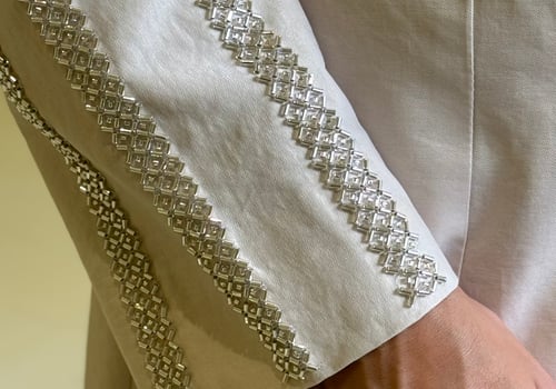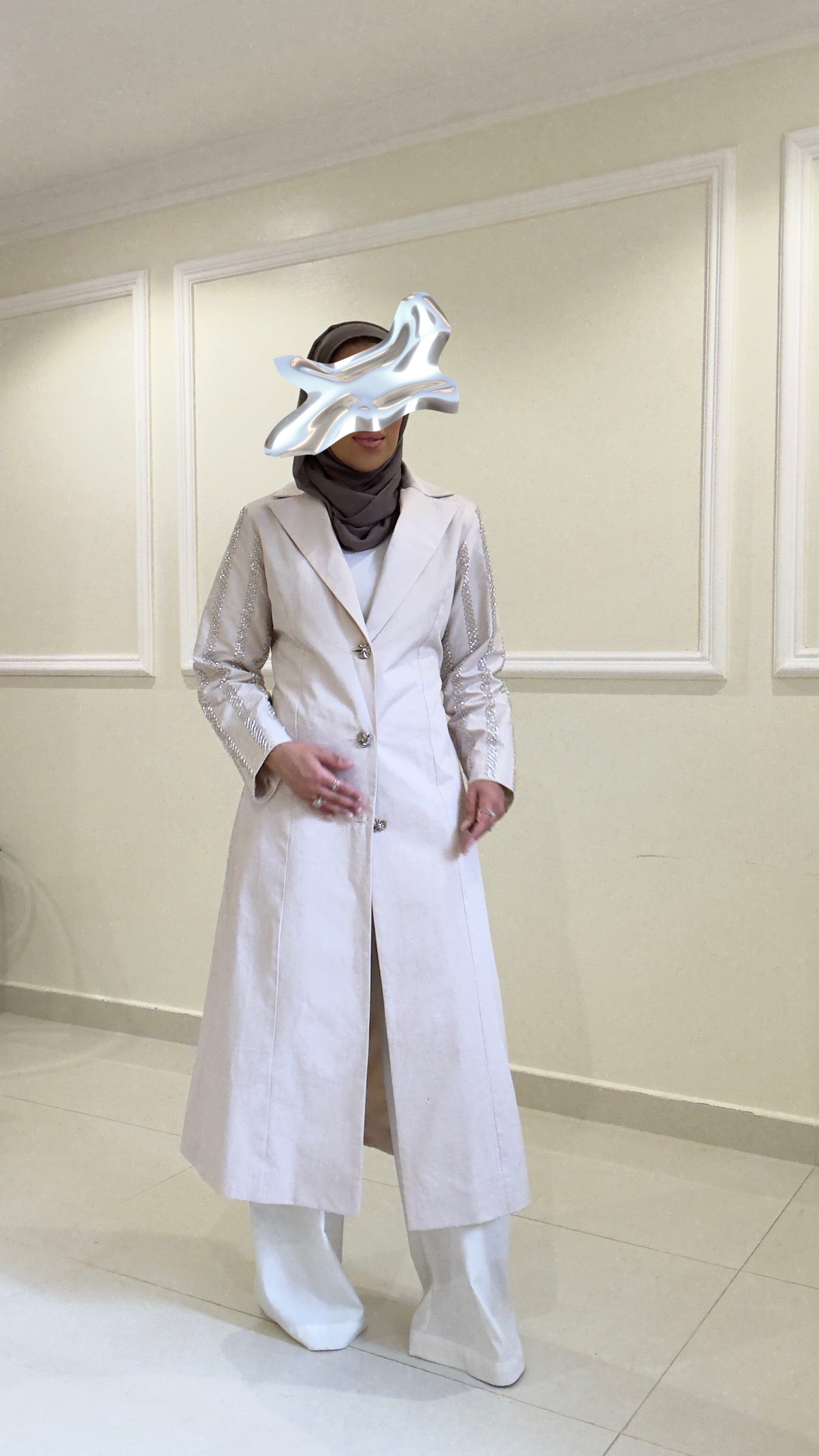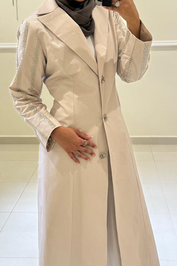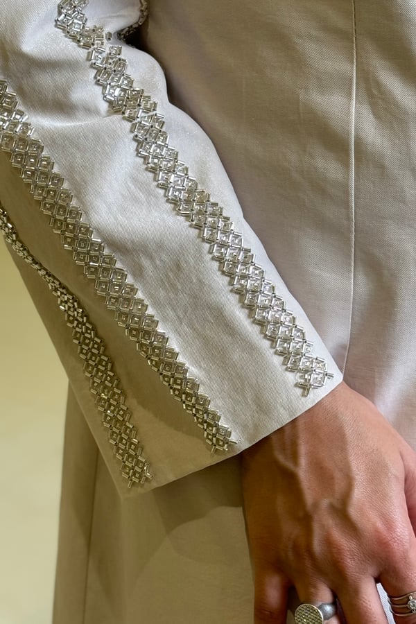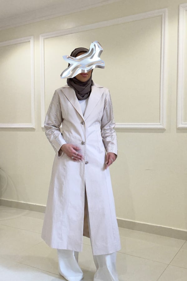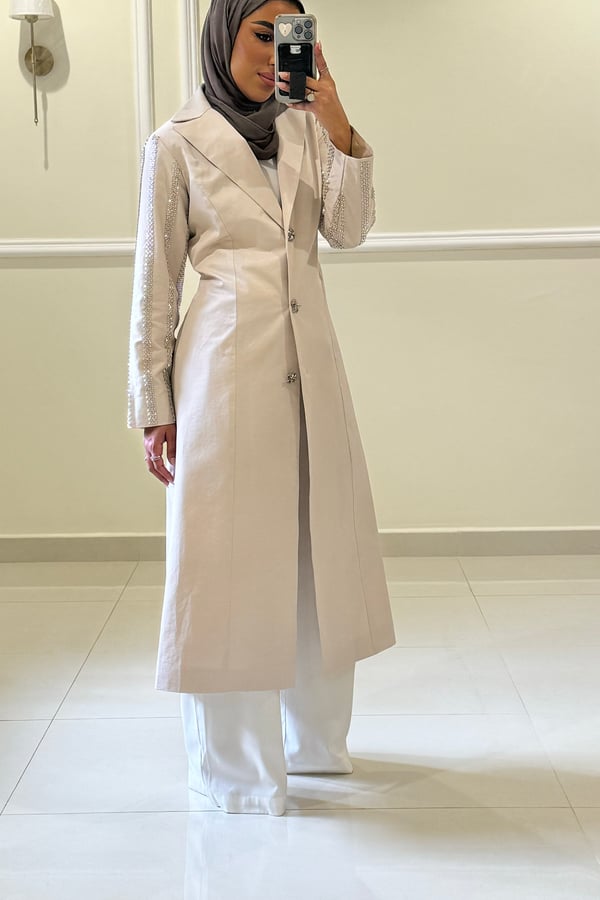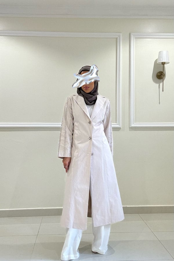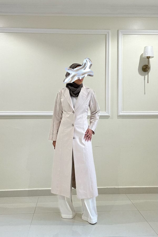 بليزر لون الاوفوايت مائل الى لون اللولو الاكمام مشكوكه قياس العارضة M طول الجاكيت المعروض ٥٠ انش في حال الرغبة بطول معيّن يرجى كتابته بالملاحظات