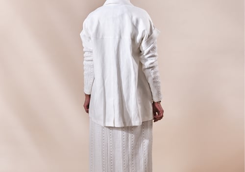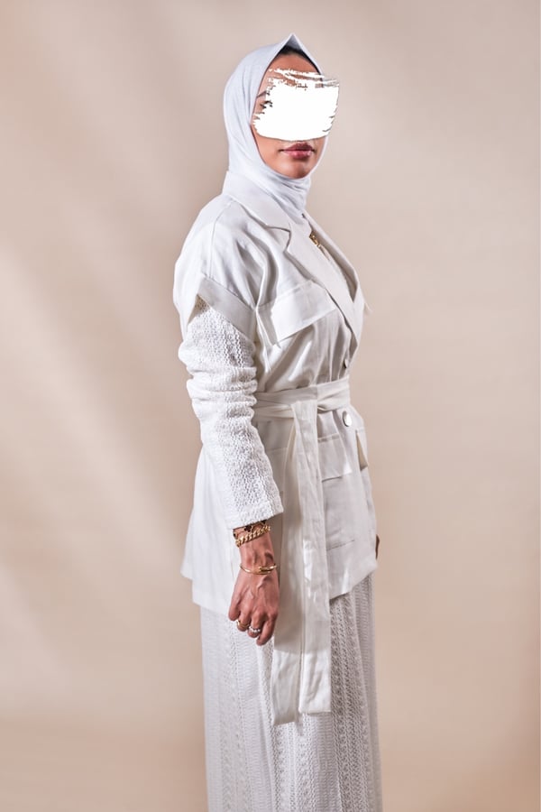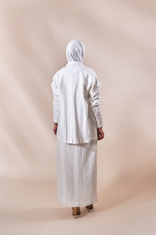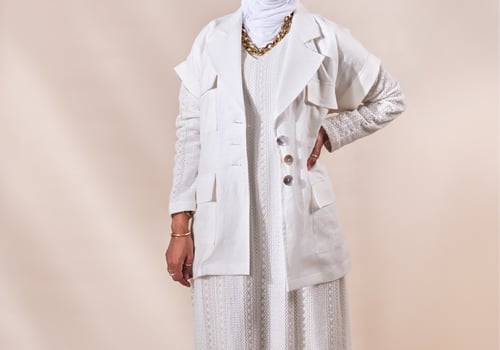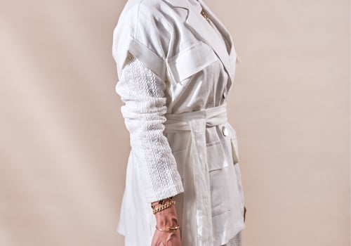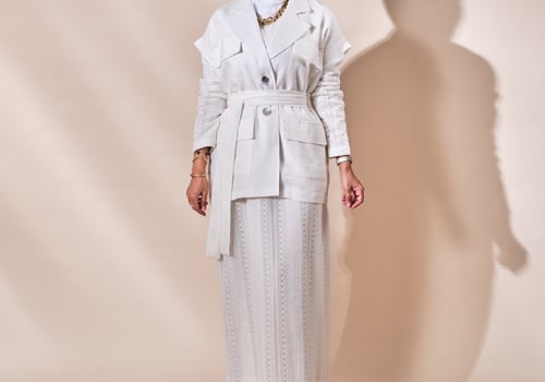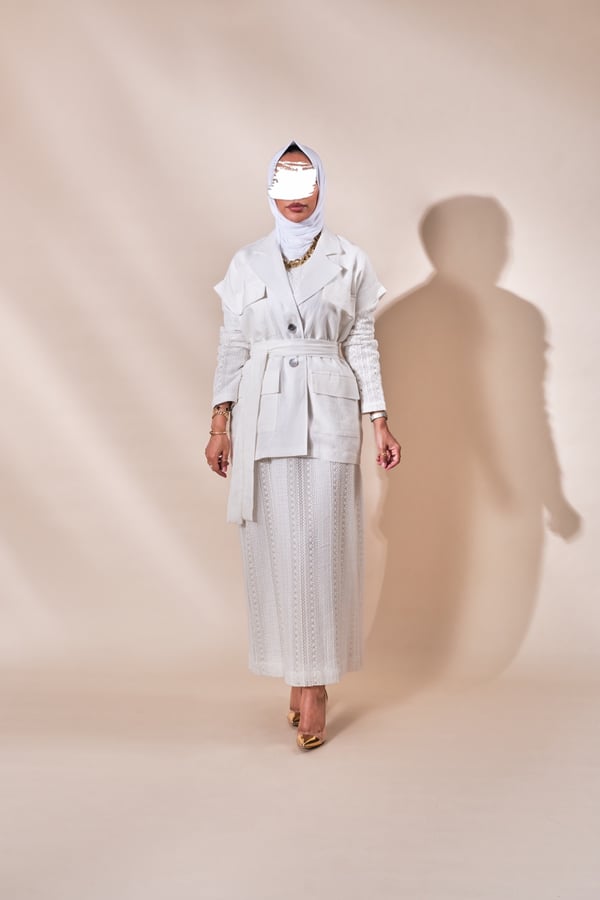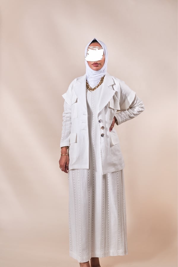 البدلة عبارة عن فستان بأكمام طويلة مبطن بالكامل مع فست واسع خام لنن الفستان في نسبة سترج